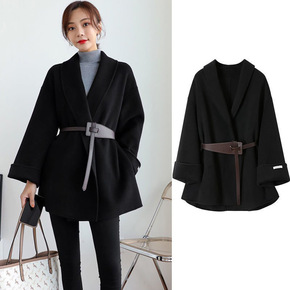 双面毛呢大衣女中长款黑色显瘦小个子斗篷型毛呢外套...