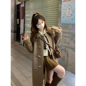 2021冬新款纯羊毛牛角扣大衣女中长款双面羊绒连帽...