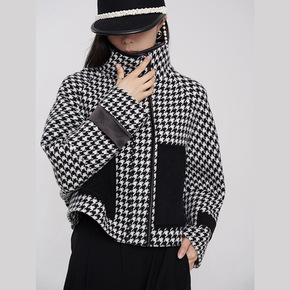 MCL 经典黑白千鸟格羊毛大衣女2021秋冬新款小...