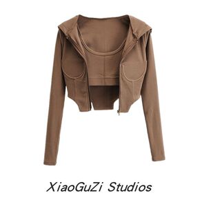 欧美风弹力秋冬吊带连帽卫衣套装螺纹拉链立体感显瘦时...