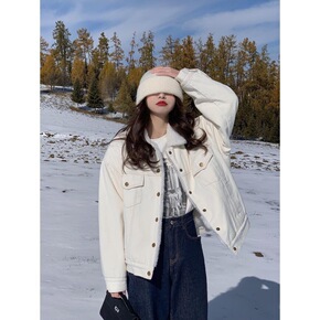 白色牛仔加绒加厚外套女秋冬小个子工装夹克羊羔毛外套...