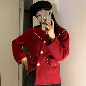 小个子红色毛呢外套女装秋冬季2021新款设计感小众...