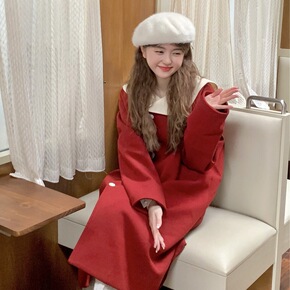 圣诞红海军领毛呢外套女秋冬季2021新款中长款小个...