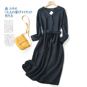 ZOJ亚麻连衣裙长袖日系女装气质v领连衣裙小个子2...