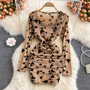 囡衣人夜总会白底印花连衣裙夏季紧身包臀小个子显瘦拼...