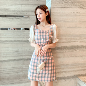 法式复古泡泡袖格子连衣裙子女小个子高ji感性感洋气...