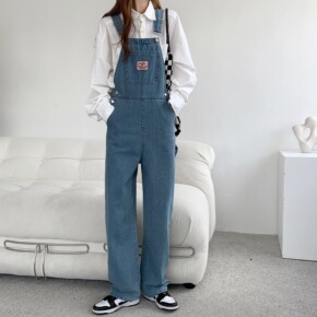 实拍韩版宽松牛仔背带裤女秋季复古减龄小个子学生直筒...