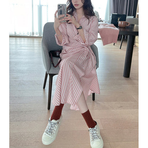 做个白桃氧气女孩/粉色条纹衬衫裙秋季法式小个子连衣...