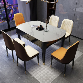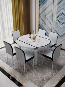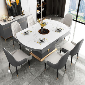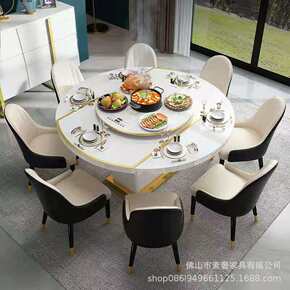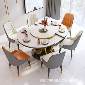 轻奢岩板餐桌可伸缩小户型多功能圆桌带电磁炉转盘家用...