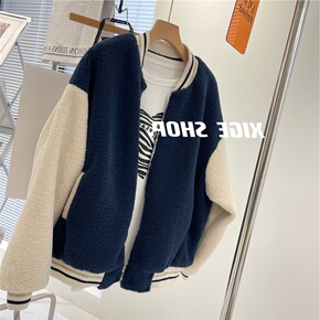 美式复古休闲羊羔毛棒球服女秋冬加厚2021新款宽松...
