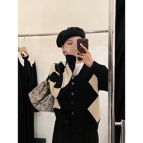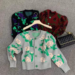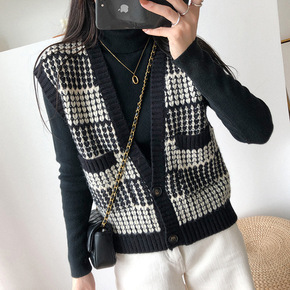 秋冬厚款复古提花图案针织马甲背心小坎肩短款开衫毛衣...