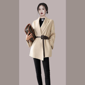 毛呢外套女秋冬季2021年韩版中长款西装领系带小个...