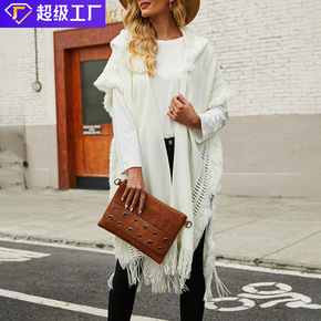 毛毛雨外贸女装2021秋冬新品长款流苏斗篷披肩连帽...