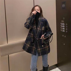 2021秋冬新款韩版小个子宽松格子毛呢外套女港味气...