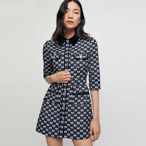 法单M家2021秋冬女装蝴蝶结印花天鹅绒衣领中袖连...