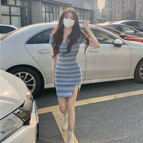 纯欲风甜辣女短袖修身性感百搭条纹小心机开叉包臀辣妹...