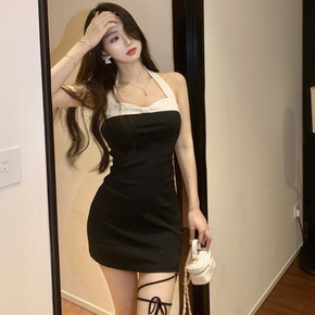 网红修身性感吊带裙小心机拼色连衣裙女小个子夏季纯欲...