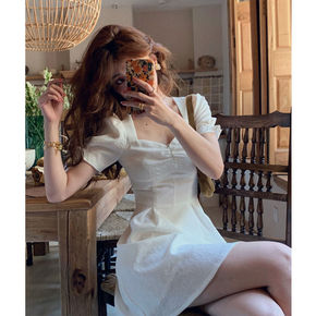 法式复古方领女2022夏季新款收腰显瘦气质锁骨小心...