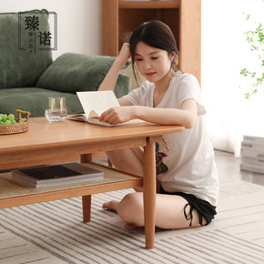 北欧樱桃木全实木茶几藤编小户型日式简约客厅茶台...