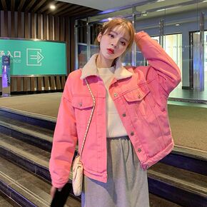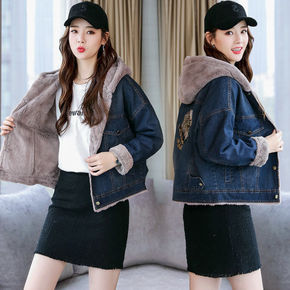 加绒加厚短款连帽牛仔棉衣外套女秋冬新款小个子韩版宽...