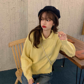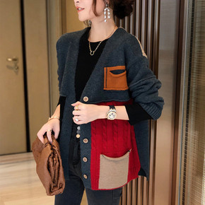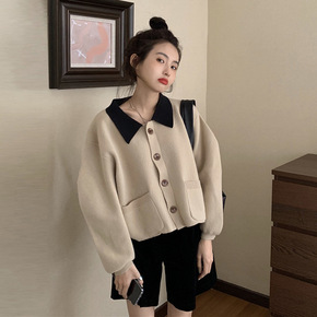 复古拼色翻领毛衣外套女2021秋冬新款宽松慵懒风针...