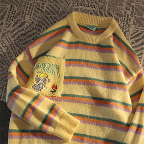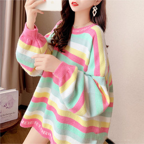 卡通彩虹针织衫女秋冬新款韩版甜美风条纹圆领套头撞色...