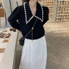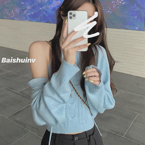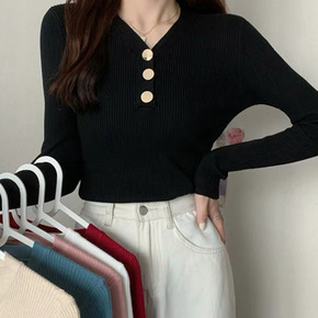 早秋2021新款内搭打底针织衫女慵懒V领黑色毛衣洋...