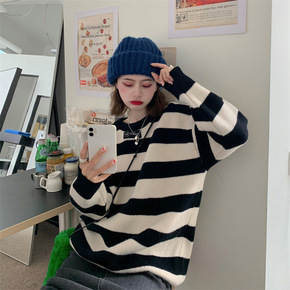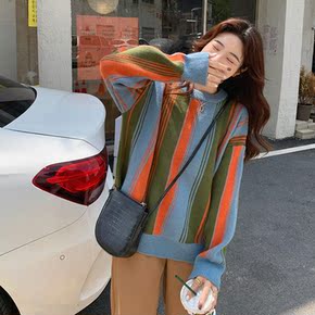 实拍 慵懒风彩虹毛衣女2021秋冬韩版竖条纹针织衫...