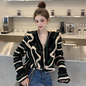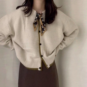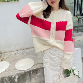 2021秋冬新款女装韩国chic法式拼色针织开衫甜...