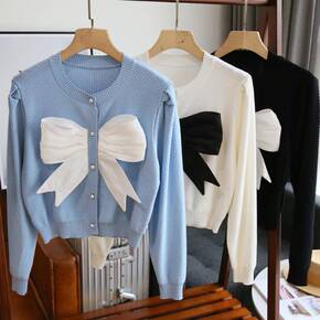 2021新款初秋甜美短款针织衫立体蝴蝶结针织开衫女...