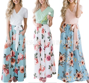 速卖通亚马逊 欧美印花拼接V领短袖高腰系带有口袋长...