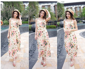 6612#女雪纺收腰显瘦背心度假沙滩裙波西米亚碎花...