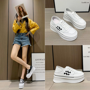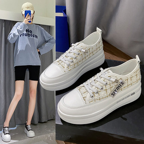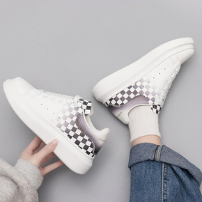 小白鞋女2022春季棋盘格休闲厚底板鞋ins韩版百...