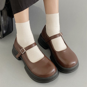 复古方头粗跟单鞋女一字扣带棕色玛丽珍女鞋学院中跟高...