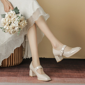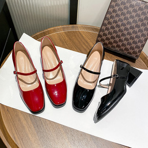方头单鞋女2022粗跟真皮一字带晚风气质法式复古j...