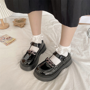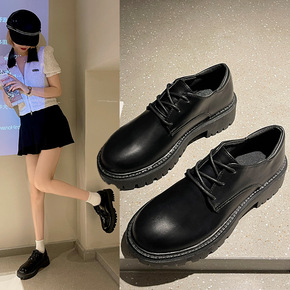 韩版系带黑色厚底小皮鞋子女夏季2022年新款乐福鞋...