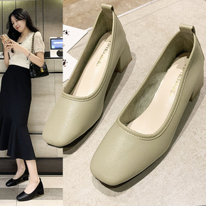 小皮鞋女夏季时尚韩版御姐冷淡风纯色浅口方头粗跟时装...