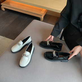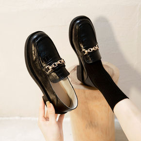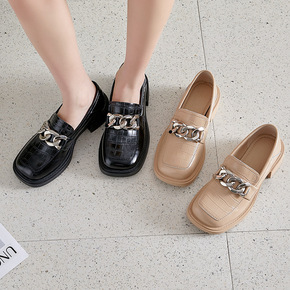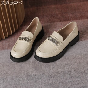 真皮乐福鞋女2021秋季新款鳄鱼纹金属粗链条时尚潮...
