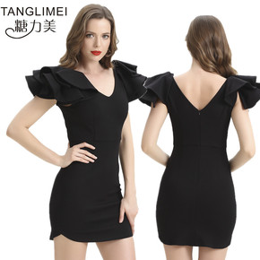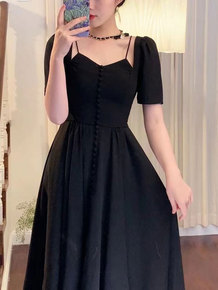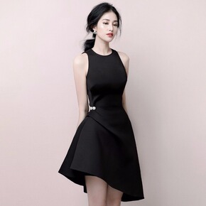 2022法式时尚女装名媛收腰黑色不规则连衣裙洋装显...