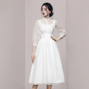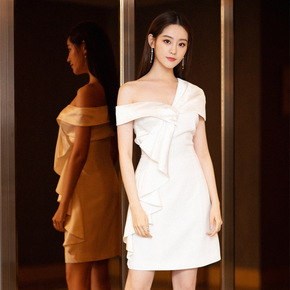 明星同款性感露肩荷叶边显瘦连衣裙女春法式少女复古白...