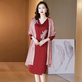 婚礼妈妈礼服2021春秋新款高端气质中长红色连衣裙...