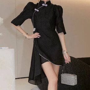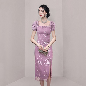 跨境女装2022新款名媛时尚改良旗袍法式长款开叉性...