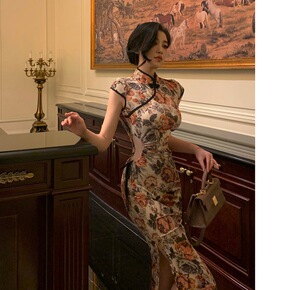 2021新款名媛时尚中长款复古时髦改良旗袍修身性感...