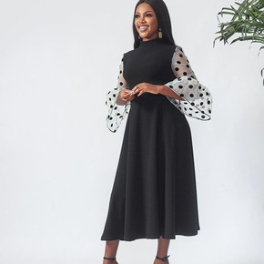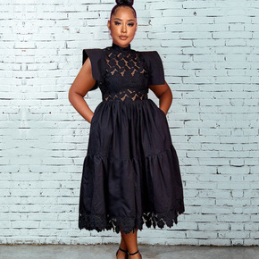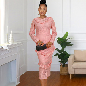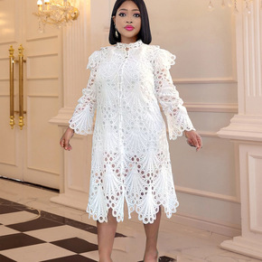 圆领性感镂空灯笼袖高腰大摆裙蕾丝派对宴会服 女装连...