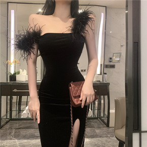 性感单肩灯笼袖高腰包臀裙开叉派对宴会服女装连衣裙 ...