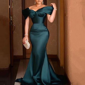 蓝色金丝绒秋冬季2021新款长袖领鱼尾裙收腰气质礼...