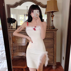 圣诞礼服裙毛毛拼接纯欲连衣裙白色秋冬季紧身开叉短款...