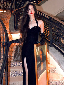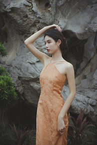 晶咕家 蕾蕾宠粉 波浪纹羽毛纱拼接SI绒旗袍连衣...