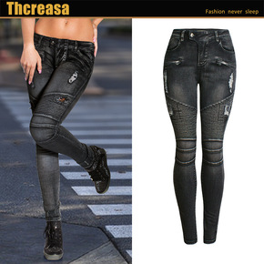 机车款欧美女装破洞修身弹力显瘦女式牛仔铅笔裤小脚裤...