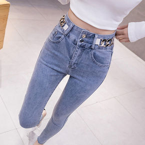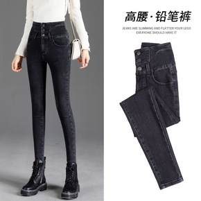 超高腰牛仔裤女2021年新款潮春季排扣小脚显瘦紧身...